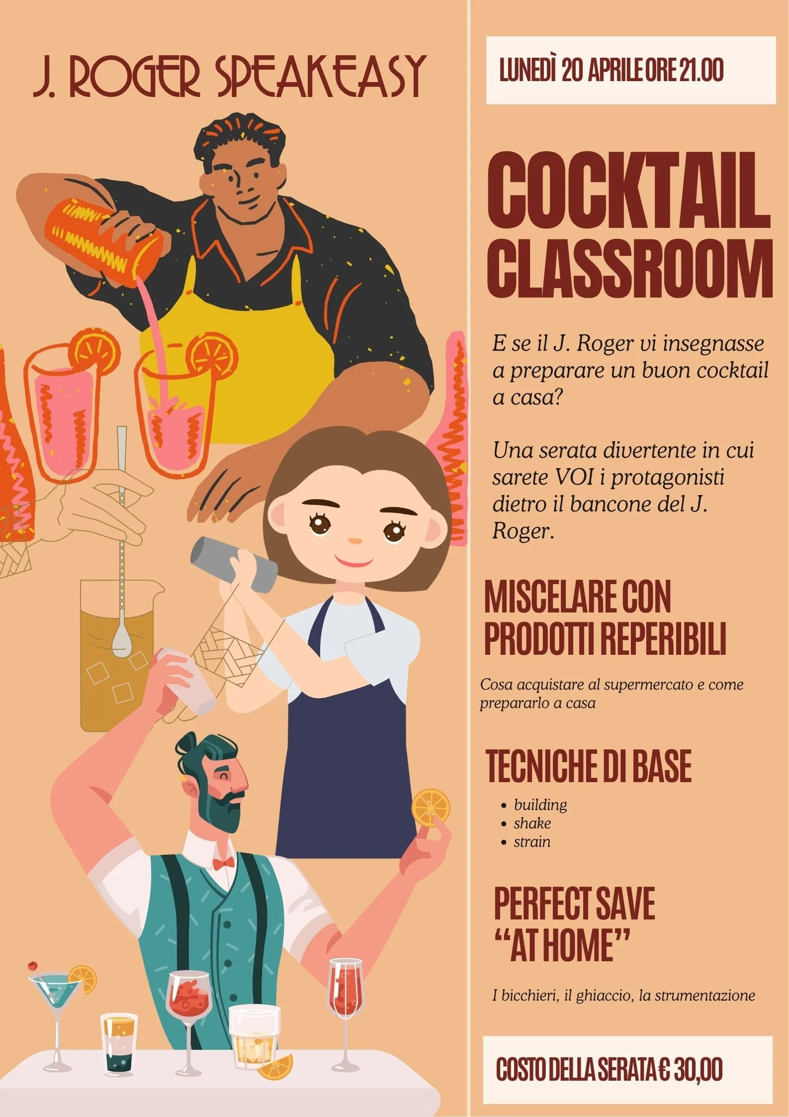Una serata divertente in cui sarete VOI i protagonisti dietro il bancone del J. Roger. Dopo il successo delle edizioni precedenti, lunedì 20 aprile alle ore 21,00 Luca Tesser trasformerà il J. Roger in un'aula sperimentale e vi insegnerà le tecniche di base per preparare dei buoni cocktail a casa vostra, utilizzando prodotti facilmente reperibili al supermercato.
